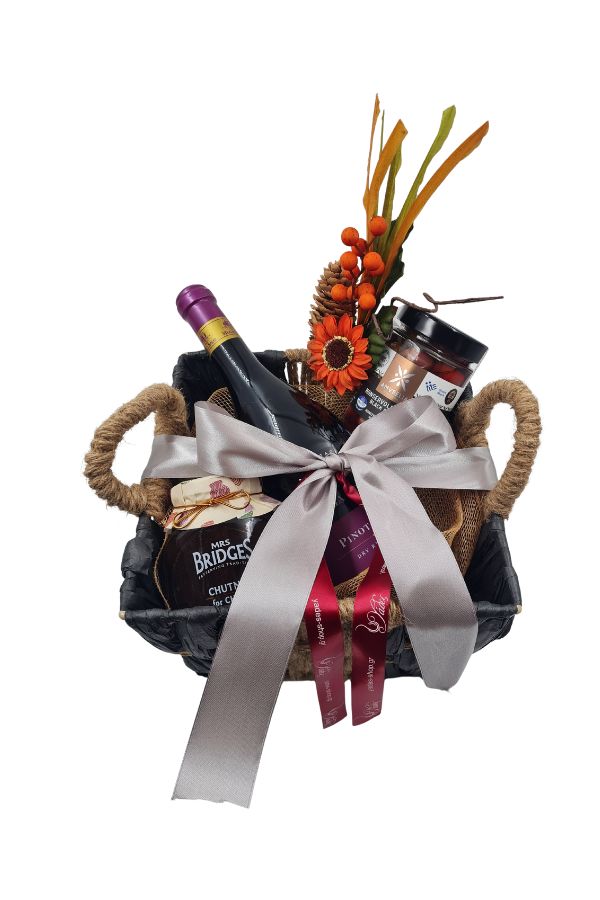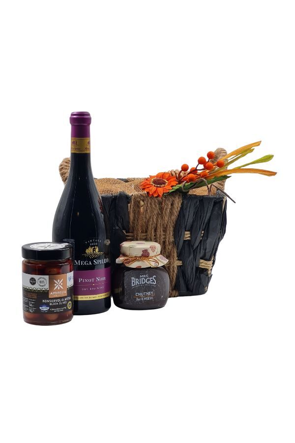 Το συγκεκριμένο gift basket συνδυάζει τρεις προσεκτικά επιλεγμένες gourmet επιλογές που συμπληρώνουν η μία την άλλη. Οι μαύρες ελιές Konservolia Artas της Amvrelia, ένα φίνο chutney για τυριά της Mrs Bridges και ένα κομψό Pinot Noir (Οίνος Ερυθρός Ξηρός) συνθέτουν μια ολοκληρωμένη γαστρονομική εμπειρία, χωρίς υπερβολές και χωρίς εντονότερη έμφαση σε οποιοδήποτε προϊόν.